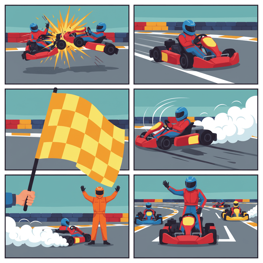 | Bandera Amarilla | Peligro en la pista (accidente, kart detenido) | Reduce velocidad y no adelantes. |